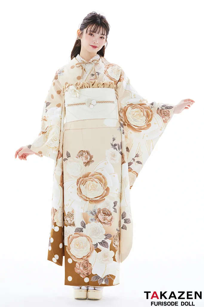 ヘップバーン ブラウンベージュ/淡色/くすみカラー セレブ バラ柄/リボン柄 スワロフスキー付き かわいい振袖 南琴奈【通販可】23037